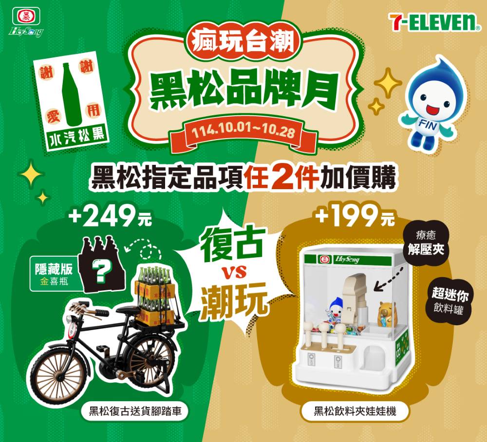 結合7-ELEVEN的「烤炸大對決」活動,凡於10月1日至10月28日間至7-ELEVEN購買任兩件黑松指定品項,加價249元可獲得「黑松復古送貨腳踏車」、加價199元便可將「黑松飲料夾娃娃機」帶回家!