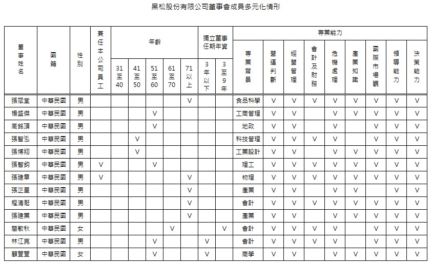 本公司董事會成員除具備各專業能力(如:食品科學、工商管理、地政、科技管理、工業設計、理工、物理、產業、會計及商學)外,亦皆有豐富之產業與工作經驗協助經營團隊擬定公司的重大策略,以提高公司績效。董事會成員多元化情形如下表: